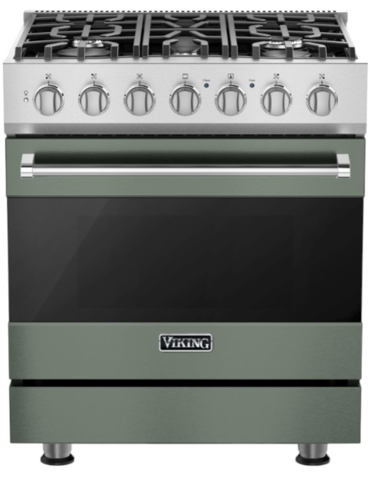The Viking® Eucalyptus 30" Dual Fuel Range features a stunning antique bronze finish and combines gas burners with electric convection. It offers precision cooking and a timeless look, enhancing any kitchen's style.Read More