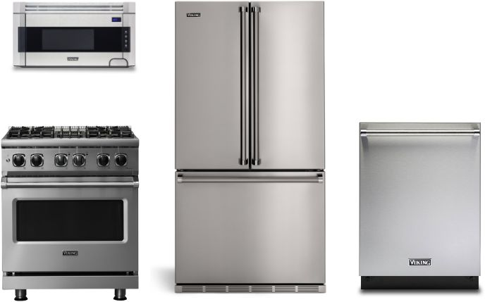 Viking® 4 Piece Stainless Steel Kitchen Package with a french door refrigerator, pro style dual fuel range, built in dishwasher, and over the range microwave.Read More