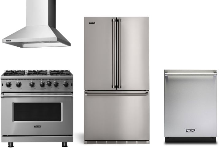Viking® 4 Piece Stainless Steel Kitchen Package with a french door refrigerator, pro style natural gas range, built in dishwasher, wall mounted range hoodRead More