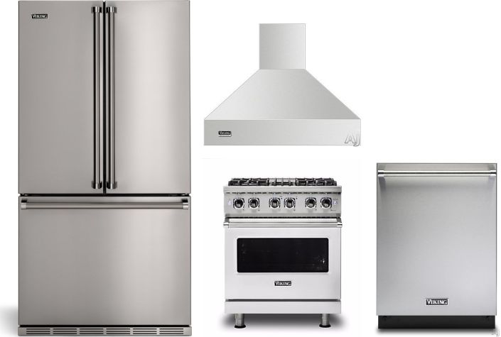 Viking® 4 Piece Stainless Steel Kitchen Package with a french door refrigerator, pro style dual fuel range, built in dishwasher, and range hoodRead More